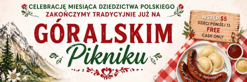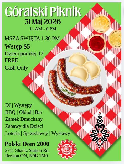 Związek Podhalan w Kanadzie nr 7 (Cambridge–Kitchener–Waterloo–Guelph) serdecznie zaprasza na Góralski Piknik, który odbędzie się 31 maja 2026 roku w godzinach 11:00 – 20:00 w Polskim Domu 2000 w Breslau.